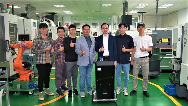 ►華聯智科公司董事總經理陳俊華(中)與臺北科技大學製造科技研究所副教授李志鴻(右三)帶領的研究團隊,再創產學合作新亮點。 陳華焜/攝影。